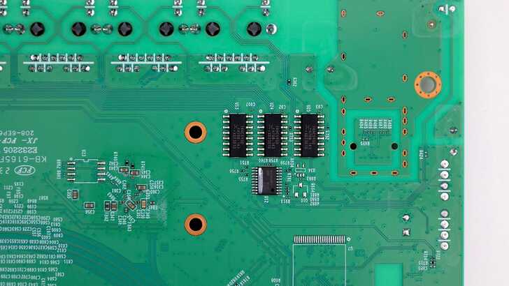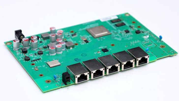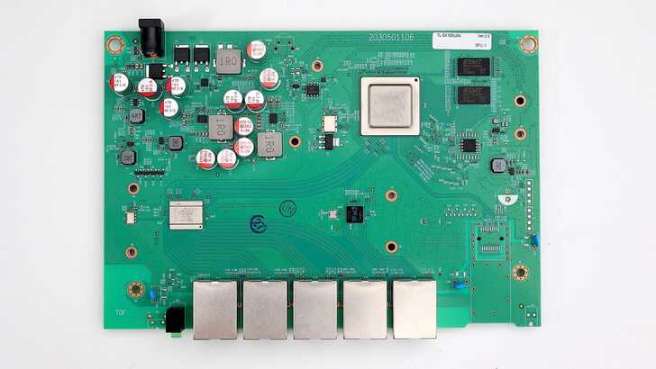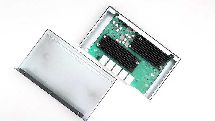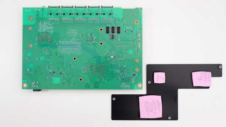 卸下散熱片後,可以看到主板分佈。主要由處理器連接到兩顆轉接,再對應五個 RJ45。
