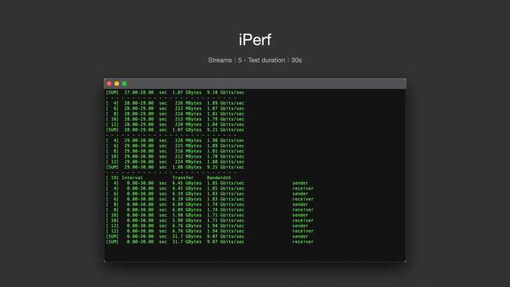 而 iPerf 在 Stream:5 的測試條件下,可以看到頻寬達到 9.07Gbps,都有發揮 10GbE 的速度。