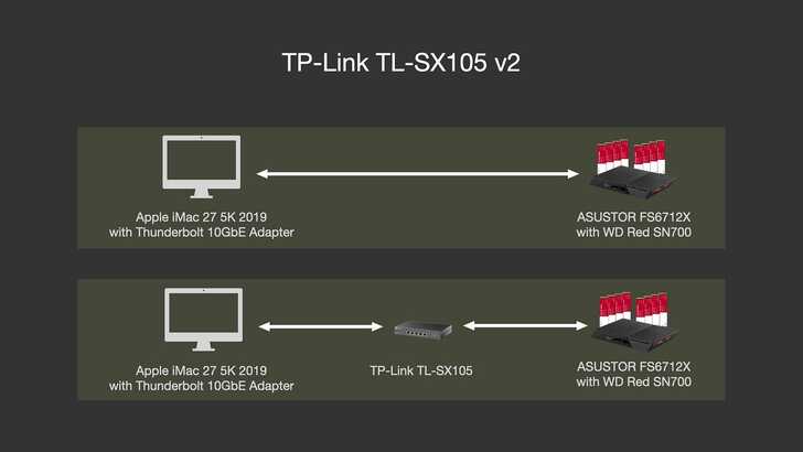 實際做個測試,看看 TL-SX105 的連結能力。使用 iMac 27 5K 2019,透過 QNAP QNA-T310G,這是一顆 Thunderbolt 3 to 10GbE 的轉接。並使用 Polywell Cat.6 5m 連接到 ASUSTOR FS6712X,這是一台 10GbE All Flash NAS。
