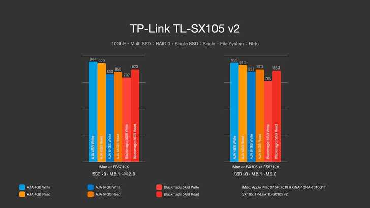實測有直連與經過 TL-SX105 的速度,使用 AJA Disk Speed test 和 Blackmagic Disk Speed Test 來測試。速度表現很不錯,加總分數略低於直連,但個別項目有反超。後來也有透過 iMac,將 DAS 中的資料 6TB 傳送到 FS6712X 當中,速度表現也很穩定,NAS、Switch 的溫度都在合理範圍內。