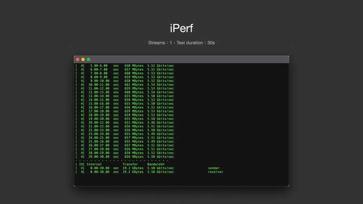 那麼在 iPerf 測試中,以 iMac 27 5K 2019 作為 Client,先經由 QNAP QNA-T310G 將 Thunderbolt 轉接成 10GbE,再連接到 TP-Link TL-SX105。而 Server 端則是 AMD Ryzen 7900X 主機,使用主機板上內建的 10GbE 連接到 10GbE Switch。先測試 Stream:1 的情況,得到頻寬為 5.50Gbps。