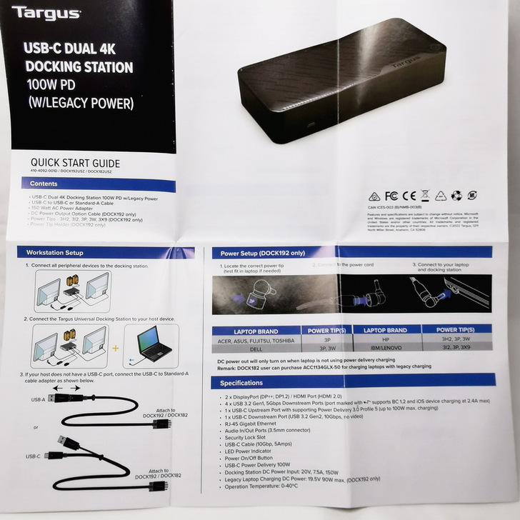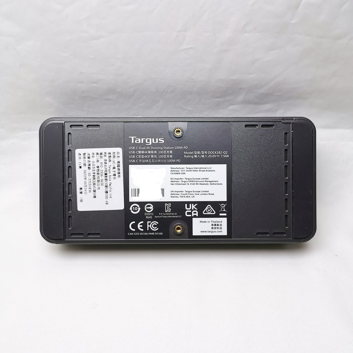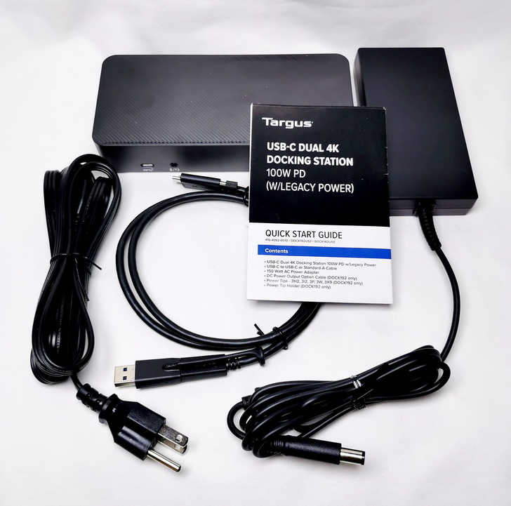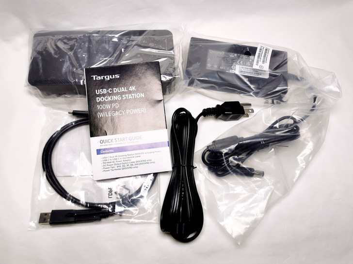 ▼ 全部的配件:Targus DOCK182 DV 4K 100W 本體、說明書、電源變壓器、三芯電源線、雙用 Type-C 傳輸線。