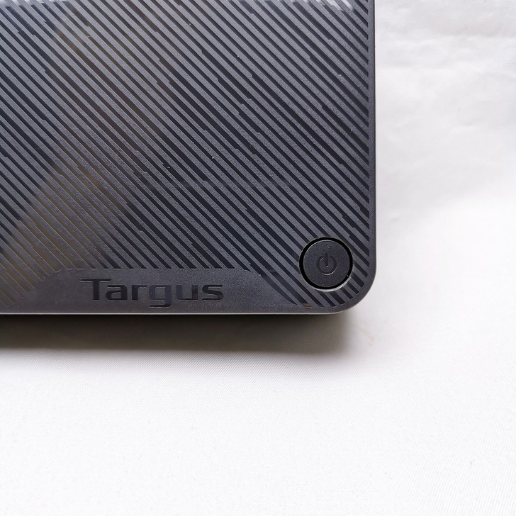 ▼ Targus DOCK182 機身為長方型,整體為深灰色外觀,右下角有 Targus字樣、電源鍵。