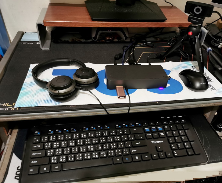 ▼ 除了 三個隨身碟,還接了 Targus AKM610 無線鍵盤滑鼠組、Targus AEH104 立體聲耳機麥克風、Targus AVC042 進階版網路攝影機,兩個螢幕輸出。