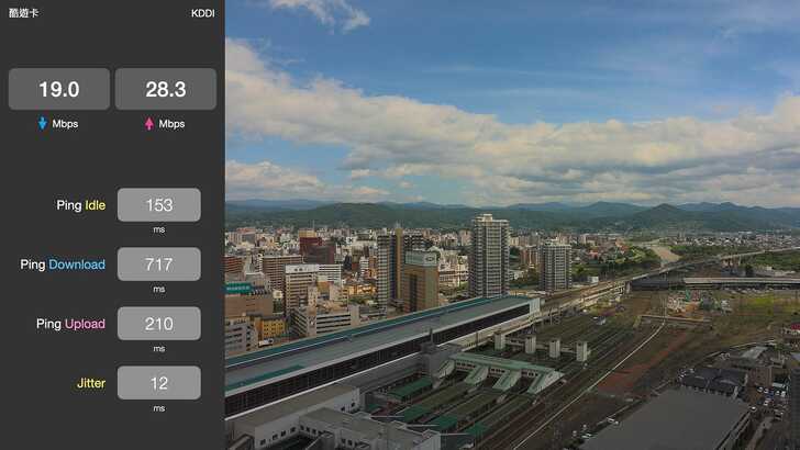 第二個測試點在岩手県盛岡市,位於盛岡駅旁的大樓,MALIOS(マリオス)。從車站出來後,經過連通道天橋到西口,會看到公車站在右手邊。穿過廣場直接可以進入大樓,搭乘電梯到 20F。實測下載速度 19.0Mbps,上傳速度 28.3Mbps。Ping Idle 為 153ms,Ping Jitter 為 12ms。