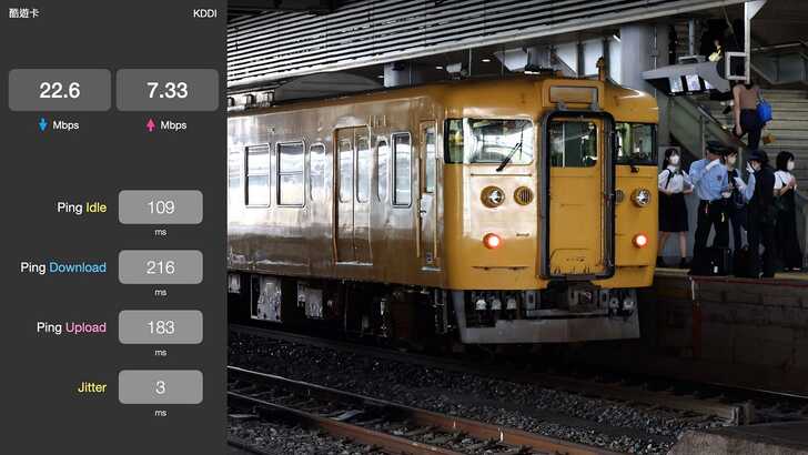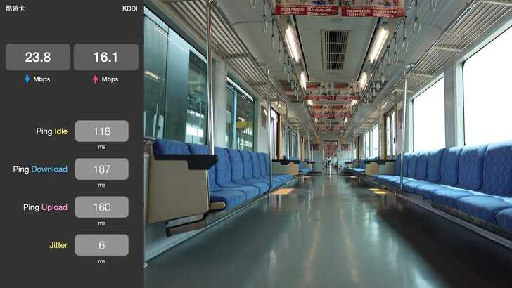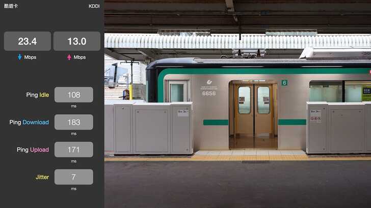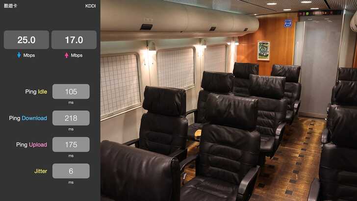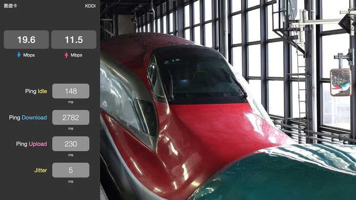 第七個測試點是新潟駅,這邊停靠了許多 W7 系,非常帥氣。實測下載速度 24.8Mbps,上傳速度 2.39Mbps。Ping Idle 為 145ms,Ping Jitter 為 13ms。