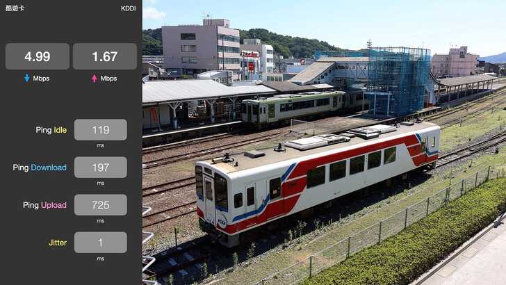 第四個是宮古駅,位於岩手県宮古市。實測下載速度 4.99Mbps,上傳速度 1.67Mbps。Ping Idle 為 119ms,Ping Jitter 為 1ms。從盛岡到宮古,因為有 JR Pass,選擇搭乘 JR 山田線。當天可能已經觸及 FUP(公平使用原則),所以下載速度只有 5Mbps 左右。