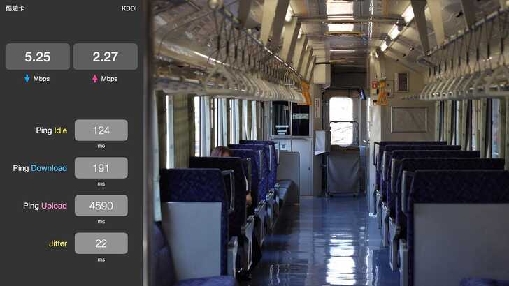 第五個測試點同樣在岩手県宮古市,也是山田線上較大的站,茂市駅。列車在茂市駅停靠比較久,就在座位上測試一下網路。實測下載速度 5.25Mbps,上傳速度 2.27Mbps。Ping Idle 為 124ms,Ping Jitter 為 22ms。這條鐵路大多是在山谷和山洞中穿梭,附近杳無人煙,除了一些靠近村落的地方有網路,很多時候是完全沒訊號。建議可以安排休息、看風景或準備一些事情做。