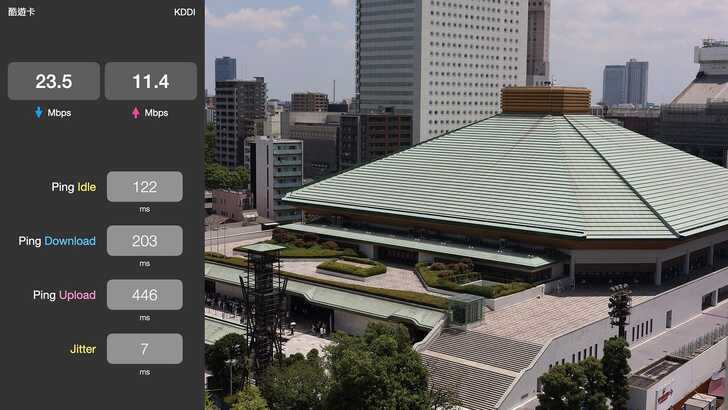 第九個測試點是位於東京墨田區的両国駅,距離前一個秋葉原只有兩站。両国駅旁就是知名的地標,兩國國技館以及江戶東京博物館。可惜江戶東京博物館在大翻修,且預計要等到 2025 年。實測下載速度 23.5Mbps,上傳速度 11.4Mbps。Ping Idle 為 122ms,Ping Jitter 為 7ms。