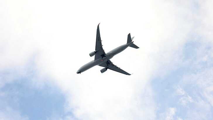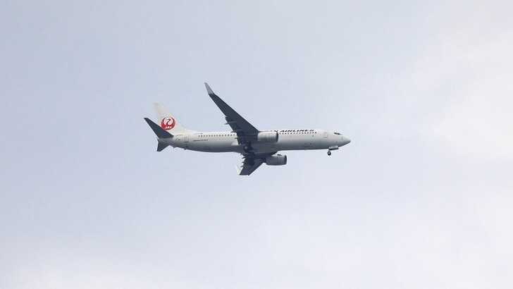 由於從這個方向降落的跑道有兩個,因此可以感受到對應兩邊進場的飛機從兩個方向經過。面向北邊,右側的飛機距離比較遠,左側的飛機距離比較近。例如這張是左側來的飛機,可以更完整看到飛機下方的樣貌。