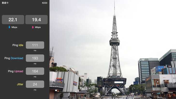 第十六個測試點在大名古屋ビルヂング,是名古屋駅附近的地標,從車站桜通口出來後,過馬路就可以抵達。實測下載速度 24.7Mbps,上傳速度 7.65Mbps。Ping Idle 為 118ms,Ping Jitter 為 6ms。