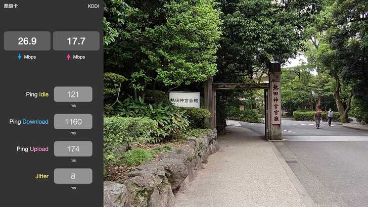 第十七個測試點是位於名古屋市熱田區的地標,熱田神宮。鄰近名鐵的神宮前駅,下車就可以看到入口,往上走一段路就可以到。神宮前站附近也有很多好吃的餐廳,在車站另一側也有 μPLAT,有超市和商店,樓上也有一些桌椅可以休息。在熱田神宮實測下載速度 26.9Mbps,上傳速度 17.7Mbps。Ping Idle 為 121ms,Ping Jitter 為 8ms。