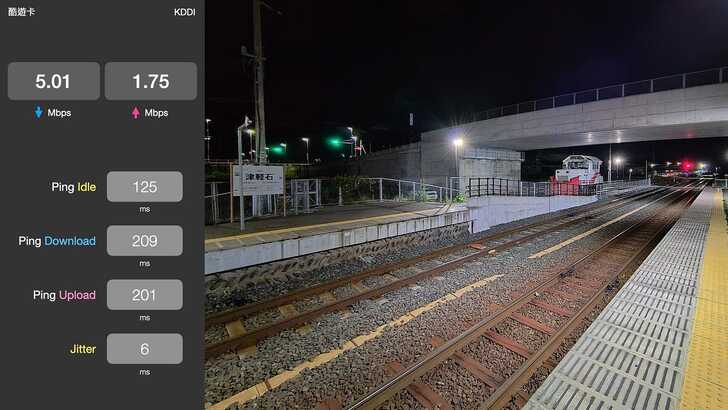 第六個測試點在宮古市岩手縣的津輕石駅,屬於三陸鐵道谷灣線。在這邊主要是為了前往拍攝《鈴芽之旅》的電影場景。實測下載速度 5.01Mbps,上傳速度 1.75Mbps。Ping Idle 為 125ms,Ping Jitter 為 6ms。
