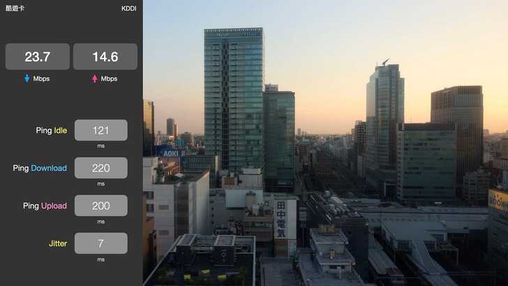 第八個測試點是東京都千代田区的秋葉原駅。即便人潮非常多,但測試的速度也很不錯。實測下載速度 23.7Mbps,上傳速度 14.6Mbps。Ping Idle 為 121ms,Ping Jitter 為 7ms。圖中是從飯店拍攝凌晨秋葉原的樣貌,因此天空泛著橘色到藍色的美麗漸層,秋葉原車站的十字型主體在畫面右下方。拍攝面向北方,與視線平行的是京濱東北線和山手線。遠處還可以看到御徒町駅,早上就可以看到兩個車站間,密集往來的班次。