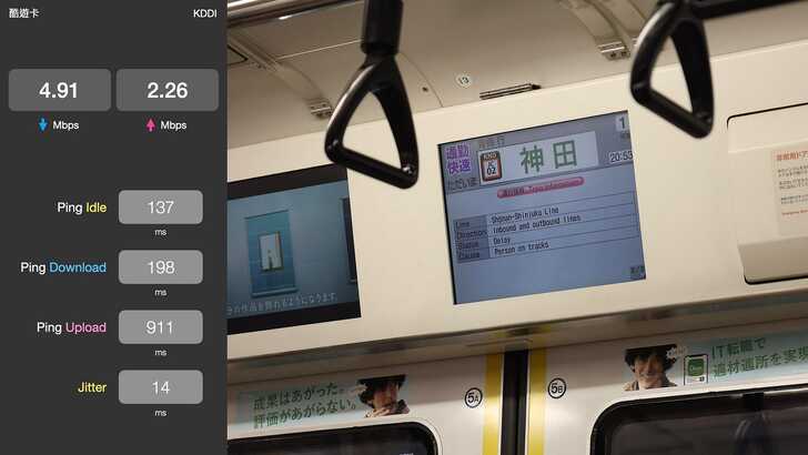 第十個測試點是位於東京都千代田區的神田駅。當時剛從東京站上車,搭乘中央線,結果才行駛一站到神田,列車就不關門了。隔了幾分鐘後得知是遇到人身事故,就順便測試一下網路速度。實測下載速度 4.91Mbps,上傳速度 2.26Mbps。Ping Idle 為 137ms,Ping Jitter 為 14ms。