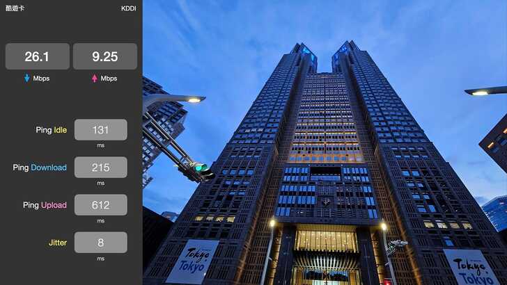 第十一個測試點是位於東京都新宿區的東京都廳的南展望室,展望室位於 45 樓。測試時展望室人潮滿多的,但速度測試還是有不錯的水準。實測下載速度 26.1Mbps,上傳速度 9.25Mbps。Ping Idle 為 131ms,Ping Jitter 為 8ms。
