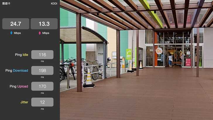 第十四個測試在名古屋 mozo WONDER CITY。實測下載速度 24.7Mbps,上傳速度 13.3Mbps。Ping Idle 為 116ms,Ping Jitter 為 12ms。