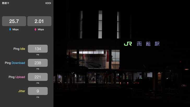 首先看到第一個測試點。搭乘新幹線到北海道新函館北斗,再轉車到函館。函館駅是終端式月台,走出車站就是公車站。在函館站實測下載速度 25.7Mbps,上傳速度 2.01Mbps。Ping Idle 為 134ms,Ping Jitter 為 9ms。