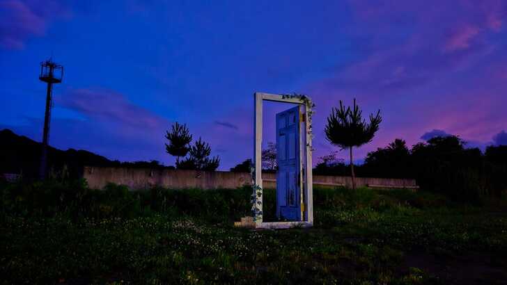 宮古運動公園陸上競技場停車場對面,可以找到《鈴芽之旅》的門,遠遠就可以看到電波塔。距離三陸鐵道谷灣線的津輕石駅,Google Map 的估算約 1.4km,步行 18 分鐘。當時到達津輕石駅的時間稍晚,太陽下山的速度也很快。當時深怕拍不到想要的天空背景,因此加快步伐,實際步行約 15 分鐘抵達,不過還是相當累,感覺走了非常久。若當時行程提早個半小時,那麼後面就不會那麼倉促。