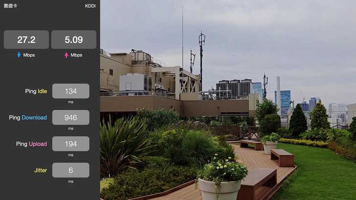 第十二個測試點在 atre 恵比寿,這個商場跟恵比寿駅共構。在恵比寿西館搭電梯到 8F,推開玻璃門就可以到室外的アトレ空中花園。有一小區可以遮陽的地方,靠牆有一排椅子可以小歇。花園不大,但人也不多,大家都集中在遮陽廊道。實測下載速度 27.2Mbps,上傳速度 5.09Mbps。Ping Idle 為 134ms,Ping Jitter 為 6ms。