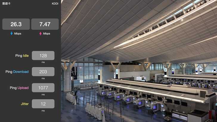 第十三個是羽田機場第三航廈 4F,這層有許多商店和休息區,也包括日本橋。實測下載速度 26.3Mbps,上傳速度 7.47Mbps。Ping Idle 為 128ms,Ping Jitter 為 12ms。