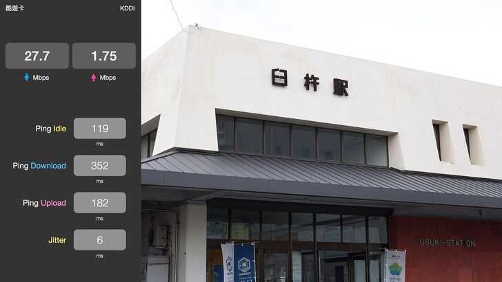 第二十六個測試點是壬生川駅,是 JR 四国予讃線上的一個車站。實測下載速度 8.90Mbps,上傳速度 6.64Mbps。Ping Idle 為 116ms,Ping Jitter 為 6ms。