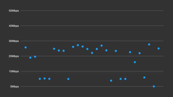 從測試結果來看,不管在日本的大都市還是在鄉下,下載速度普遍在 20~30Mbps 之間。這樣的速度平常分享網路給筆電,在筆電上看 Google Map、Youtube 1080P 影片都沒問題。有八次測試落在 5Mbps 左右,當下訊號其實不差,或許是官網說明中提到觸發 FUP 的表現。5Mbps 對於手機使用 Google Map 還是可以使用,只是會變慢許多。觀察其規律在隔日就會恢復速度,這點也與酷遊卡官網敘述一樣。