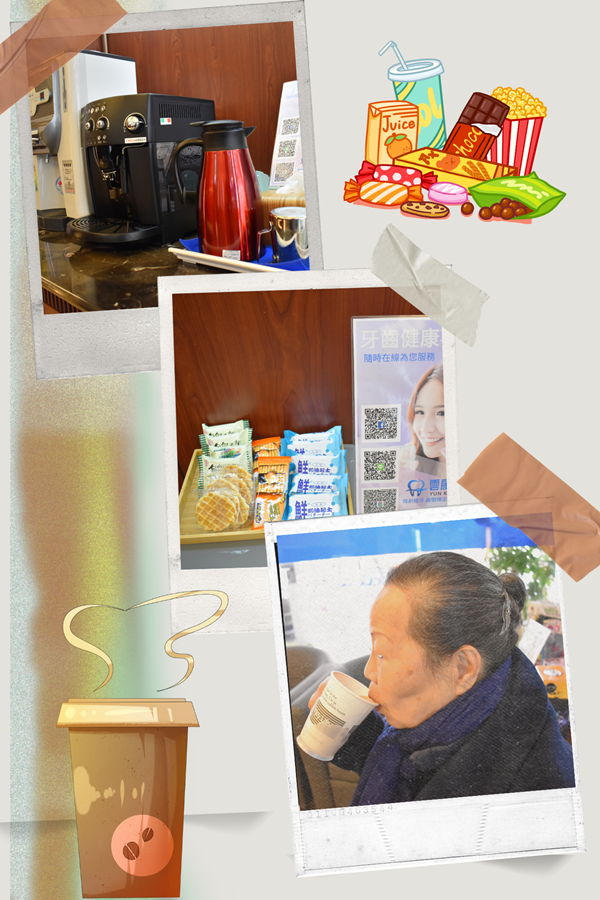 登記完基本資料後在候診區等候時,發現有很多零嘴跟咖啡可以吃可以喝~一邊等奶奶一邊划手機看享受下午茶爽快~