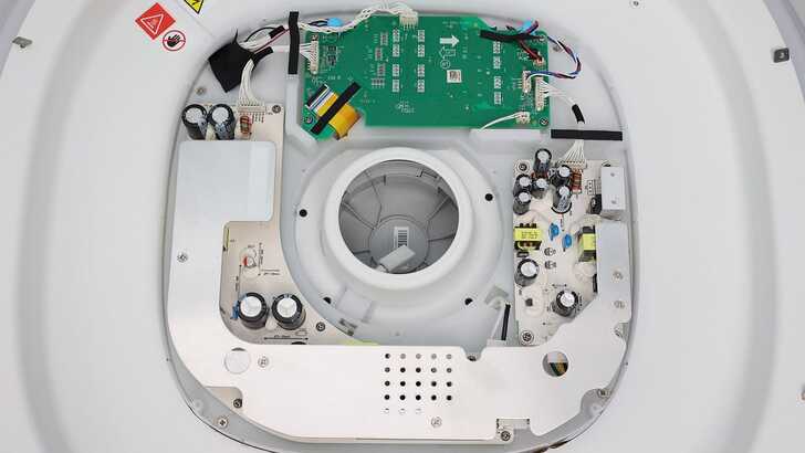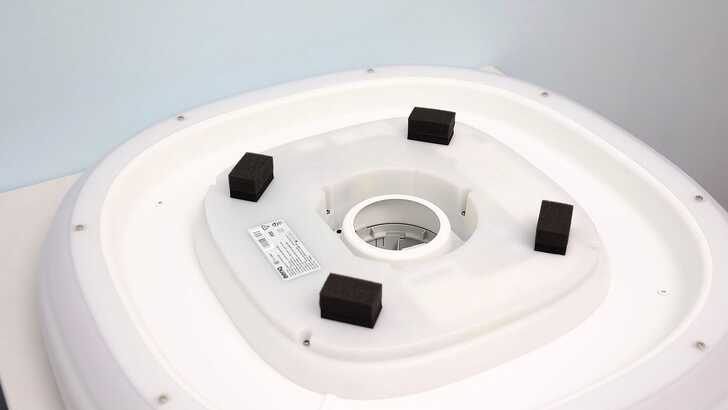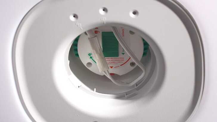 頂部周圍有四個黑色長方形海綿,用於穩定機身與天花板,不用拆卸。卸下頂部塑膠燈罩上的螺絲,沒有防拆手段,滿友善的。不過說明書中有明確寫到不要拆開產品,並可能會喪失保固。