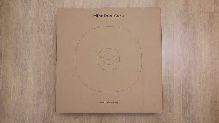 官網標示中文名稱叫「智能吸頂燈」不太像台灣用語,覺得還是智慧吸頂燈比較順口,也呼應「智慧照明」這個分類。包裝正面有 Aora 本體的輪廓造型,下方有 BenQ Smart Lighting 字樣。