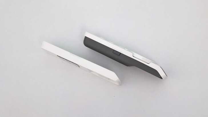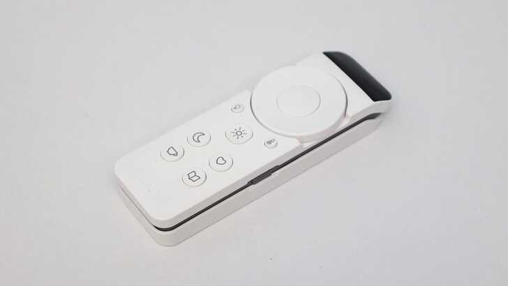 白色遙控器,上面有一個旋鈕,下面有幾個 icon 樣式的按鈕。雖然是塑膠外殼,但是質感相當不錯。