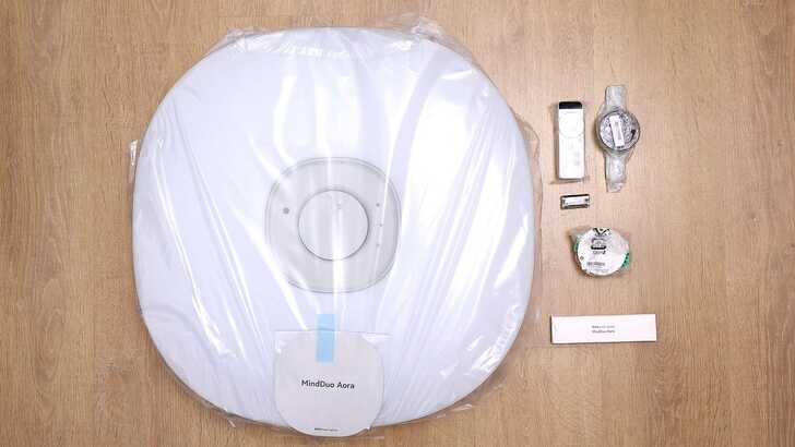 卸下令人起雞皮疙瘩的保麗龍後,可以看到產品與配件。中間是 Aora 本體,一旁則有遙控器、遙控器 AAA 電池、上引掛器、下引掛器、螺絲。