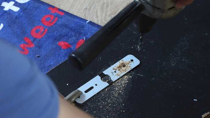 打算沿用原本天花板就有的螺絲,但由於原本的螺絲較粗,無法穿過鐵片。比起重新向上打兩個洞,改變鐵片比較方便,因此拿了電鑽把原本的孔搪大一點。為了施作方便,就將上引掛器與鐵片分離。鐵片滿薄的,實際上不太算搪,就是正反面斜角度磨一磨就可以了。