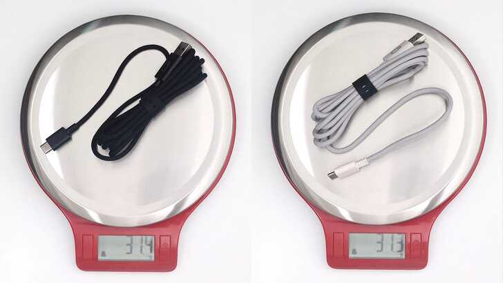 在線材上,ROCCAT PURE Air 是用編織線,左邊黑色款重量為 31.4g,右邊白色款重量為 31.3g。特別想講 Air 的編織線,質地很柔軟,所以不容易出現凹痕,且線頭、線尾兩端金屬質感很好,採用 USB-C to USB-A 連接。