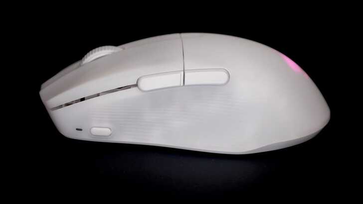 在 RGB 方面除了手掌處的 Logo 外,按鍵縫隙以及滾輪處就都沒有做 RGB 了。很有趣的是,從縫隙間可以看到一些內部金屬零件以及滾輪結構,且如果是白色款,側邊也可以看到內部零件的顏色。