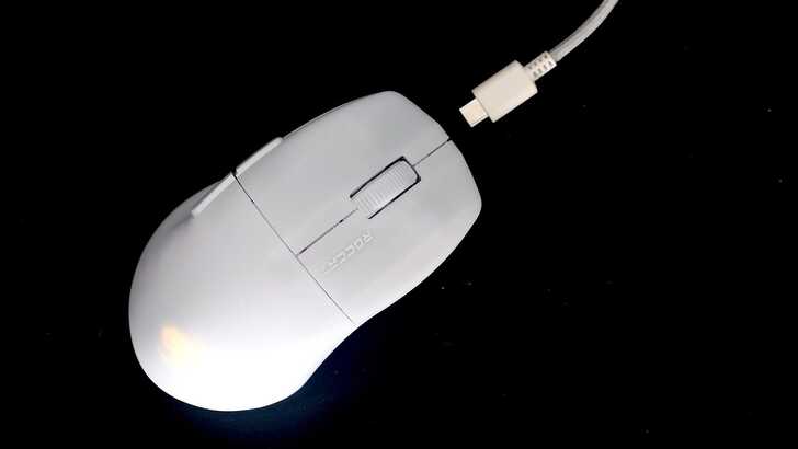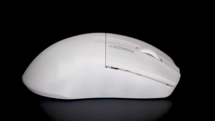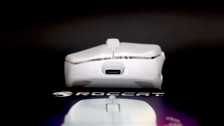 從俯視角看也能夠略微看到 USB-C 接頭和本體的色差。再來就是 ROCCAT 有將 Logo 刻在右鍵內側,白色款如圖片呈現。黑色款的 Logo 則是深灰色,但和本體顏色很相近,所以不會太突兀。