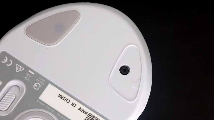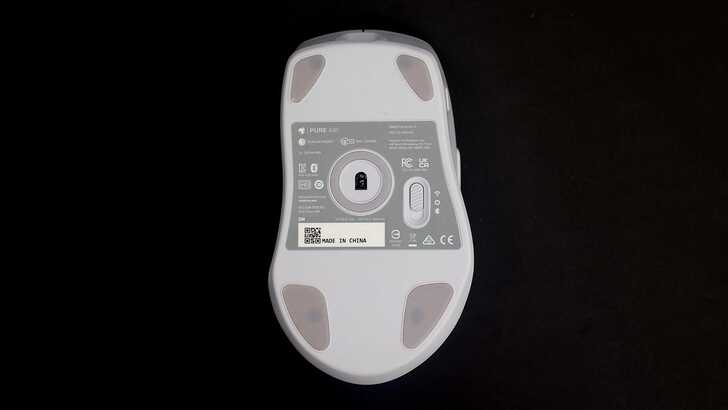 底部四邊以及感測燈周圍都有 PTEF 貼片,可以讓使用時更滑順,實際體驗下來跟一般滑鼠差異不會到很大。因為我自己本身有滑鼠墊,所以 PURE Air 在滑鼠墊上使用時還是會有一定阻力。另外 ROCCAT PURE Air 也可以調整 2.4GHz、藍牙以及有線三種連接模式。