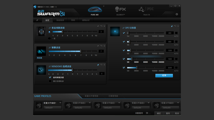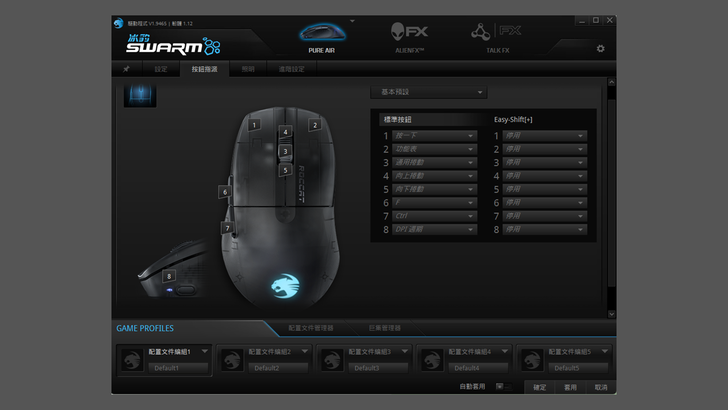 再來介紹它的 App ROCCAT Swarm,功能非常多也非常強大,這次只講一部份針對 ROCCAT PURE Air 的設定。可對 PURE Air 做的調整包括垂直捲動速度、雙擊速度、指標速度、DPI 切換、按鍵指派、RGB 設定、無線設定以及角度校正等等,個人覺得最常用到的就是 DPI 和按鍵指派。