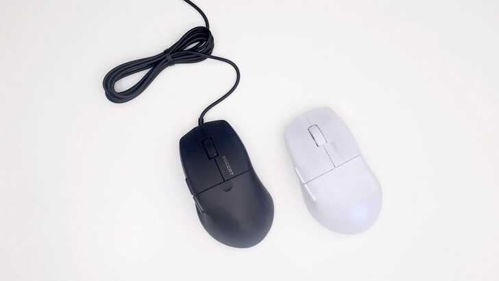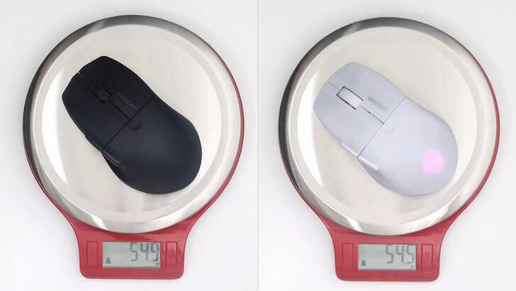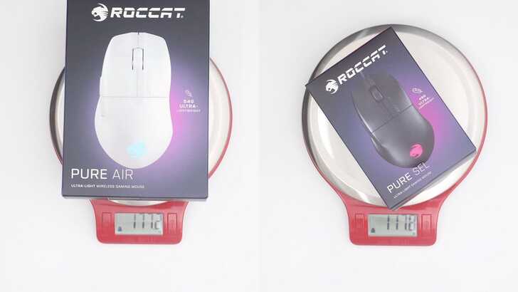 兩邊滑鼠本體都為 ROCCAT PURE Air,左邊黑色款重量為 54.9g,右邊白色款則為 54.5g,與官網標示 54g 非常相近,真的非常輕!拿在手上幾乎沒有感覺,找個成語來形容感受就是「若有似無」吧。