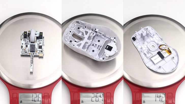 ROCCAT PURE Air 控制零件部分重量為 12.6g,上蓋為 26.4g,底殼含電池則為 14.2g。將滑鼠總重減去上面三個主要零件的重量,推測腳墊與螺絲重量約 1.3g。