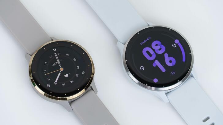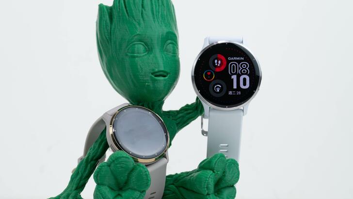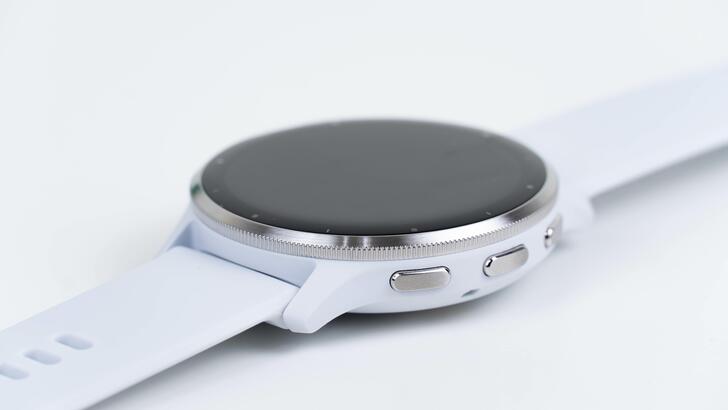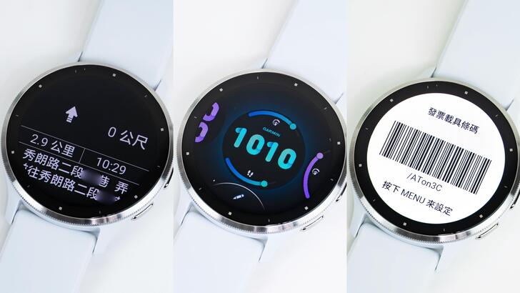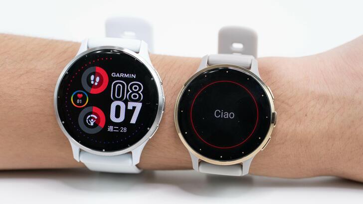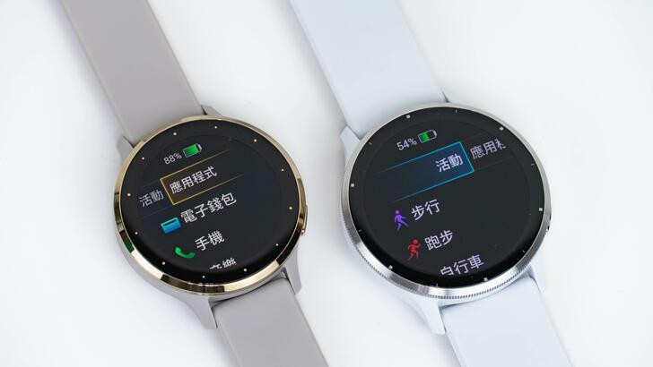 那麼回到手錶本身,Venu 3 外表相當簡潔,潔白的機身,在眾多黑色錶之中特別明顯。而左下角則是燒磚可可色的 Venu 3S,不知為何,只有 Venu 3S 才享有較多種色彩的待遇,Venu 3 僅有黑白兩色系。