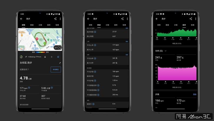 運動完成後,可以在 Garmin Connect app 中看到詳細的數據。以跑步來說,除了紀錄常見的計圈、GPS 定位、步頻、心率外,甚至連功率紀錄也有支援,可見 Venu 3 系列在運動上也是很強悍的。而在使用 Garmin Venu 運動的時候,我感受到最大的差異在於 Garmin 數據的即時性,相比其他款手錶在騎自行車時心率有些延遲,Venu 3 的心率預估的很準確,開始發力飆車時,心率就跟著一起上去了。另外除了數據的豐富與精準,Garmin Venu 3 支援的運動項目也非常的多元,游泳、電競、滑雪等應有盡有。
