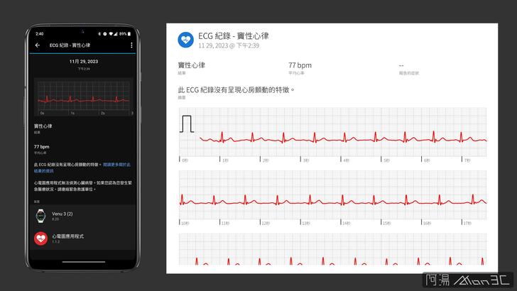 近期 Garmin 為旗下的多款手錶更新了 ECG 功能,這當然也包含使用第五代感測器的 Garmin Venu 3 系列。心電圖功能只需透過手指捏著錶環,等待 30 秒即可紀錄。事後會回報檢測結果,並提供匯出 PDF 檔案。可惜無法自行匯出 csv 等 Raw data,做其他用途使用。