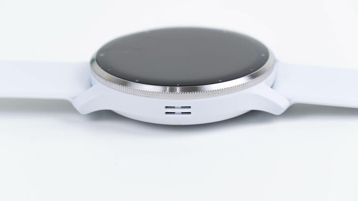 左側為揚聲器,手錶亦支援透過藍牙通話或是聽音樂。手錶機身為塑膠材質,也因此重量才能壓低一些。觸感做得很不錯,滑滑沙沙的,仍有著很好的質感。