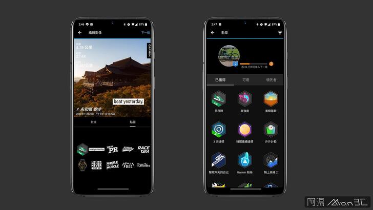 另外,為了讓用戶持續運動,Garmin 也有勳章功能,定期就會生成一些挑戰讓我去達成,達成後就可以拿到一些勳章。而運動完成後,也可以透過分享功能把運動的一些數據分享到 IG 上。