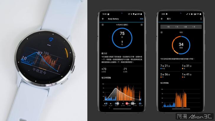 Garmin Venu 3 有一個新功能我挺喜歡的,它是 Body Battery。透過分析壓力、運動、睡眠數據,將你今天的活力量化成電池電量百分比,讓你清楚知道目前還是多少電力,非常有趣且實用。