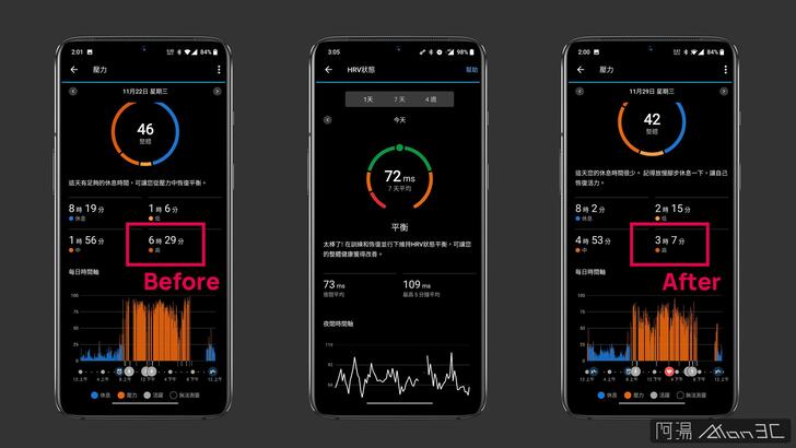 剛開始,測壓力數據時,還想說怎麼只要醒著壓力值都是滿載,我是有那麼誇張?結果帶了幾個禮拜後,我發現 Garmin 的壓力值數據是由用戶個人的 HRV 去估算的,而 HRV 數據要連續帶 2~3 個禮拜才能完整評估。因此自從 HRV 數值能夠被預估後,壓力數值就正常了許多。而這就是我覺得 Garmin 強的地方,它的這些數值不是單純的用大數據推算而已,還會依據每個人獨特的數據再去做調整。