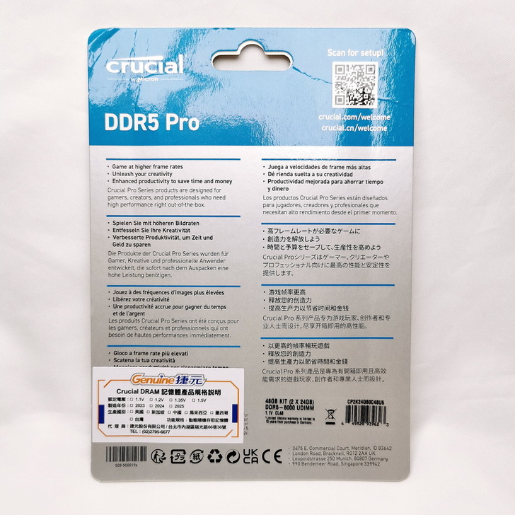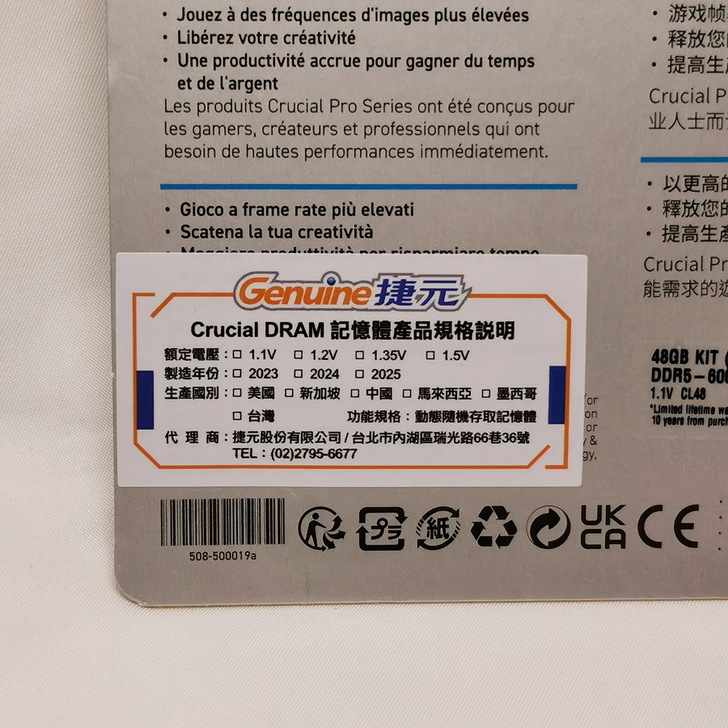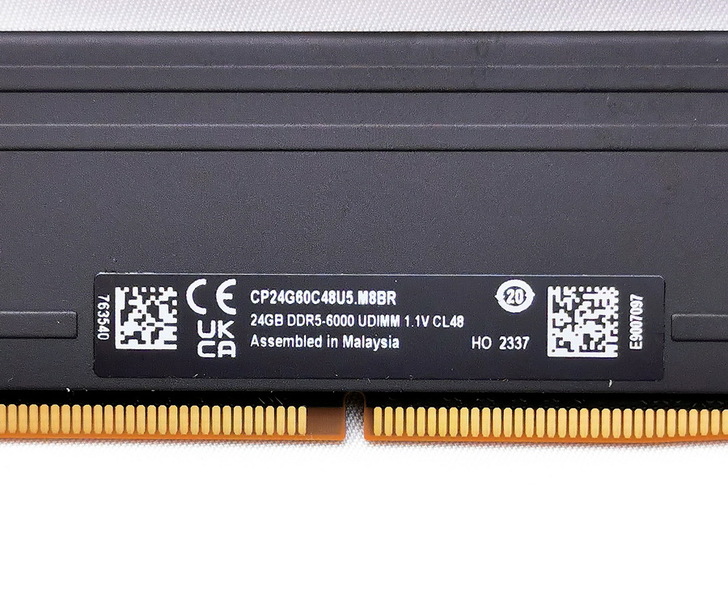 ▼ 產品貼紙上面可以看到產地為馬來西亞、容量為24GB、DDR5-6000 UDIMM、電壓1.1V、時序CL48。