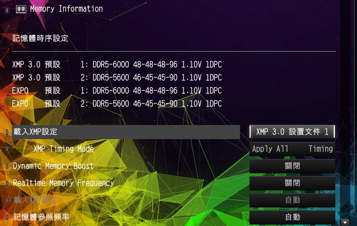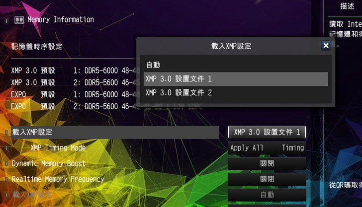 ▼ 進去BIOS可以看到 XMP 3.0、EXPO 都有兩個預設值可以設定,也有列出兩個設定值的時序。