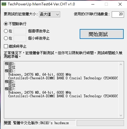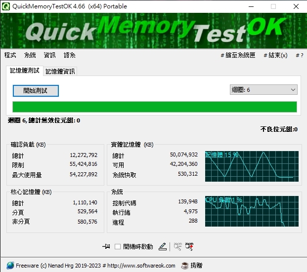 ▼ QuickMemoryTestOK記憶體檢測工具中,可以看到記憶體資訊顯示出已超頻至6400,經過測試後也是完全正常。